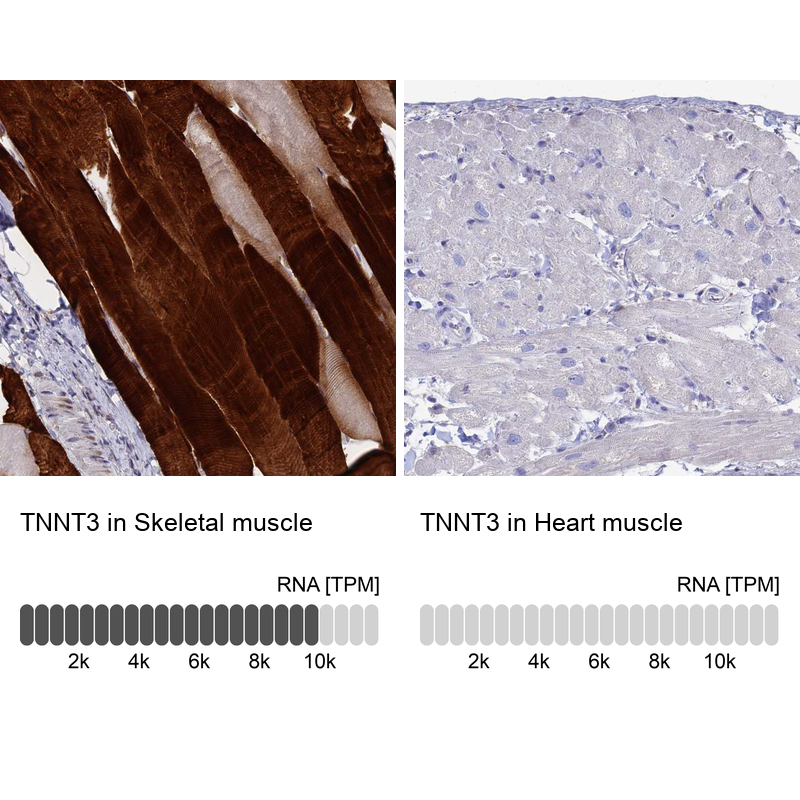 Immunohistochemistry analysis in human skeletal muscle and heart muscle tissues using Anti-TNNT3 antibody. Corresponding TNNT3 RNA-seq data are presented for the same tissues.