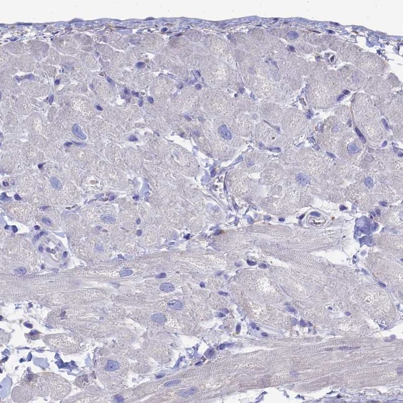 Immunohistochemical staining of human heart muscle shows low expression as expected.