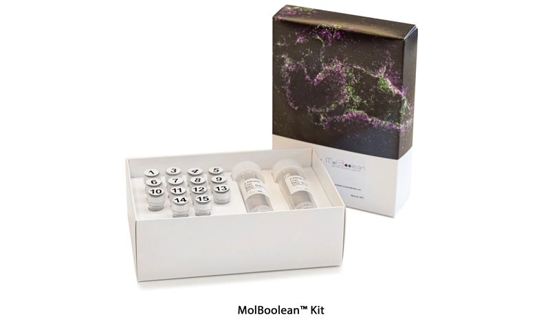 MolBoolean(TM) Mouse/Rabbit is a kit for in situ protein proximity analysis in tissue and cells. The MolBoolean assay utilizes a proprietary oligonucleotide setup that enables the simultaneous detection of both free and interacting (~40 nm proximity) fractions for two proteins of interest (protein A, protein B and interaction proteins AB). MolBoolean(TM) Mouse/Rabbit should be performed with the users primary antibodies of choice (raised in mouse and rabbit). MolBoolean relies on anti-mouse and anti-rabbit secondary proximity probes and rolling circle amplification (RCA) as a mean to amplify signal. A series of molecular steps, performed in the MolBoolean assay, incorporates information into the amplified products indicating antibody target engagement of individual versus interacting proteins. This information is converted to fluorescent signals by the binding of detection reporters, allowing visualization on a conventional fluorescent microscope. An image analysis software is provided to segment and differentiate fluorescent signals, enabling the relative quantification of free versus interacting fractions for the two analyzed protein targets in the sample. If you require customization for other target species, please reach out to us and we will accommodate your specific needs upon request.