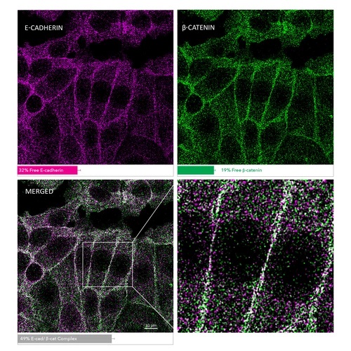 | MolBoolean(TM) Mouse/Rabbit is a kit for in situ protein proximity analysis in tissue and cells. The MolBoolean assay utilizes a proprietary oligonucleotide setup that enables the simultaneous detection of both free and interacting (~40 nm proximity) fractions for two proteins of interest (protein A, protein B and interaction proteins AB). MolBoolean(TM) Mouse/Rabbit should be performed with the users primary antibodies of choice (raised in mouse and rabbit). MolBoolean relies on anti-mouse and anti-rabbit secondary proximity probes and rolling circle amplification (RCA) as a mean to amplify signal. A series of molecular steps, performed in the MolBoolean assay, incorporates information into the amplified products indicating antibody target engagement of individual versus interacting proteins. This information is converted to fluorescent signals by the binding of detection reporters, allowing visualization on a conventional fluorescent microscope. An image analysis software is provided to segment and differentiate fluorescent signals, enabling the relative quantification of free versus interacting fractions for the two analyzed protein targets in the sample. |