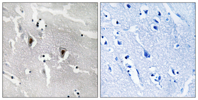 Immunohistochemical analysis of paraffin-embedded Human brain. Antibody was diluted at 1:100(4 overnight). High-pressure and temperature Tris-EDTA,pH8.0 was used for antigen retrieval. Negetive contrl (right) obtaned from antibody was pre-absorbed by immunogen peptide.