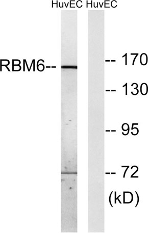 Western blot analysis of lysates from HUVEC cells, using RBM6 Antibody. The lane on the right is blocked with the synthesized peptide.