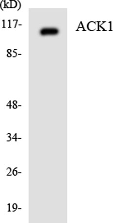 Western Blot analysis of A549 cells using ACK Polyclonal Antibody. Secondary antibody(catalog:RS0002) was diluted at 1:20000