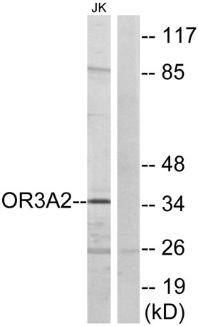 olfactory receptor family 3 subfamily A member 2(OR3A2) Homo sapiens Olfactory receptors interact with odorant molecules in the nose, to initiate a neuronal response that triggers the perception of a smell. The olfactory receptor proteins are members of a large family of G-protein-coupled receptors (GPCR) arising from single coding-exon genes. Olfactory receptors share a 7-transmembrane domain structure with many neurotransmitter and hormone receptors and are responsible for the recognition and G protein-mediated transduction of odorant signals. The olfactory receptor gene family is the largest in the genome. The nomenclature assigned to the olfactory receptor genes and proteins for this organism is independent of other organisms. [provided by RefSeq, Jul 2008],