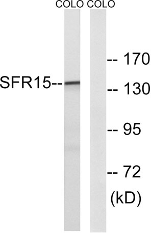 Western blot analysis of lysates from COLO cells, using SFRS15 Antibody. The lane on the right is blocked with the synthesized peptide.