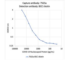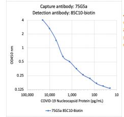 A sandwich ELISA was performed using SARS-CoV-2 (COVID-19) Nucleocapsid Protein (NP) specific rabbit monoclonal antibodies: 75G5a as a capture antibody and85C10-biotin as a detection antibody. COVID-19 NP was serially diluted 1:2 starting at 20 ng/mL. Rabbit monoclonal antibodies 75G5a and 85C10-biotin detectedCOVID-19 NP antigen at very high sensitivity as low as 19.5 pg/mL (1.9 pg).