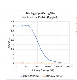 Microtiter wells were coated with SARS-CoV-2 (COVID-19) Nucleocapsid Protein (NP) and SARS-CoV NP at 1 ug/mL. Purified rabbit monoclonal antibody 75G5a wasserially diluted 1:2 starting at 1 ug/mL, and shows very strong and specific binding to COVID-19 NP antigen, with no significant cross-reactivity to SARS-CoV NP antigen.
