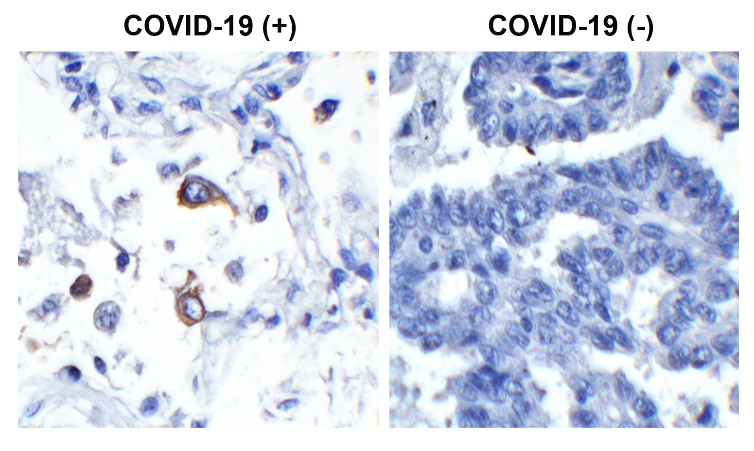 Figure 1 Immunohistochemistry Validation of SARS-CoV-2 (COVID-19) Nucleocapsid in COVID-19 Patient Lung Immunohistochemical analysis of paraffin-embedded COVID-19 patient lung tissue using anti- SARS-CoV-2 (COVID-19) Nucleocapsid antibody (10-750, 1 ng/mL). Tissue was fixed with formaldehyde and blocked with 10% serum for 1 h at RT, antigen retrieval was by heat mediation with a citrate buffer (pH6). Samples were incubated with primary antibody overnight at 4&730,C. A goat anti-rabbit IgG H&L (HRP) at 1/250 was used as secondary. Counter stained with Hematoxylin. Strong signal of SARS-COV-2 Nucleocapsid protein was observed in the macrophages of COVID-19 patient lung, but not in non-COVID-19 patient lung.
