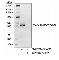 Western blot analysis of SARS-CoV2 and SARS-CoV nucleocapsid protein (50 ng) probed with 1 ug/mL CoV2NP rabbit monoclonal Antibody (75G5a), CoV2NP-75G5.