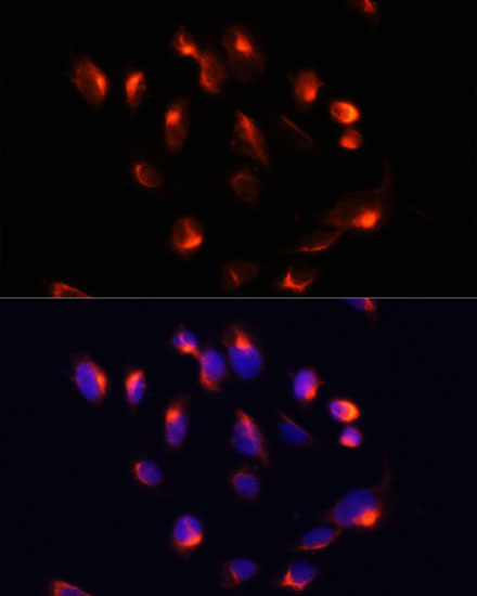 Immunofluorescence analysis of U2OS cells using CYP3A4 antibody (18-699) at dilution of 1:100. Blue: DAPI for nuclear staining.
