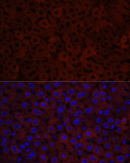 Immunofluorescence analysis of mouse liver using CYP3A4 antibody (18-699) at dilution of 1:100. Blue: DAPI for nuclear staining.