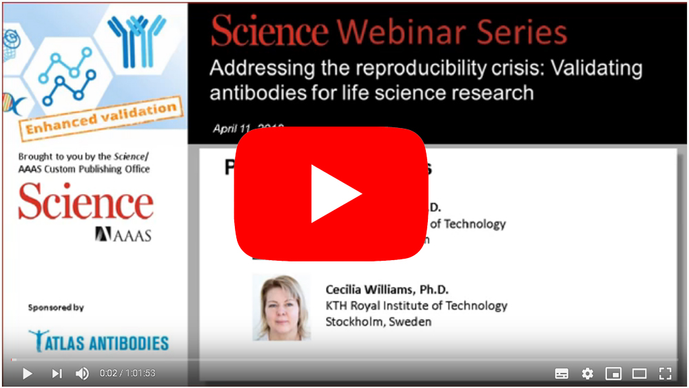 In diesem Webinar lernen Sie den Ansatz des Humanen Proteinatlas zur Antikörpervalidierung für die biowissenschaftliche Forschung kennen und erfahren alles über die fünf Methoden der erweiterten Validierung. Das englischsprachige Webinar wurde am 11. April 2018 aufgenommen, veranstaltet durch Science mit der Unterstützung von Atlas Antibodies.